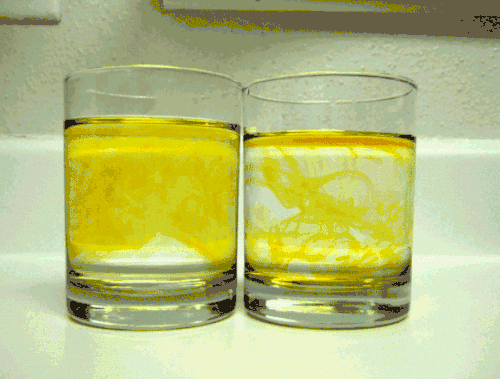 If you put a dye pill in a glass of water, it will start out concentrated in one place, but as the atoms of water move around by Brownian motion they knock the atoms of dye around until it spreads throughout the glass coloring the water evenly. This property of matter is called DIFFUSION.