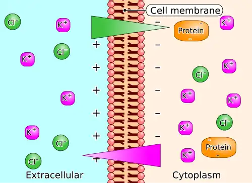The charged particles like ions near a semi-permeable membrane sometimes fail to distribute evenly across the two sides of the membrane.[23] Usually, it happens as a different charged substance could not pass through the membrane and creates an uneven electrical charge.[24] For example, the large anionic proteins in blood plasma do not permeate to capillary walls. Because small cations are attracted, but are not bound to the proteins, small anions will cross capillary walls away from the anionic proteins more readily than small cations.