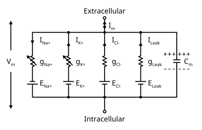 The negative charge that exists intracellularly and not electrically active, is the resting potential.[25] As potassium is also the ion with the most negative equilibrium potential, usually the resting potential can be no more negative than the potassium equilibrium potential.All cells as well as neurons have a resting potential. But in neurons and in muscle fibers, the resting potential is very important, since all electrical activity will be changes from this resting potential. The resting potential can be calculated with the Goldman-Hodgkin-Katz voltage equation using the concentrations of ions as for the equilibrium potential including the relative permeabilities, or conductances, of each ionic species.