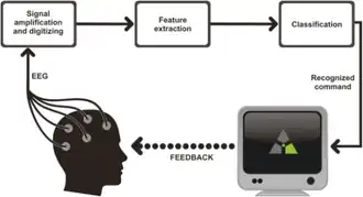 A general scheme of an EEG-based BCI. The interface consists of an EEG acquisition system, data processing software for feature extraction and pattern classification, and a system to transfer commands to an external device and, thus, providing feedback to an operator.