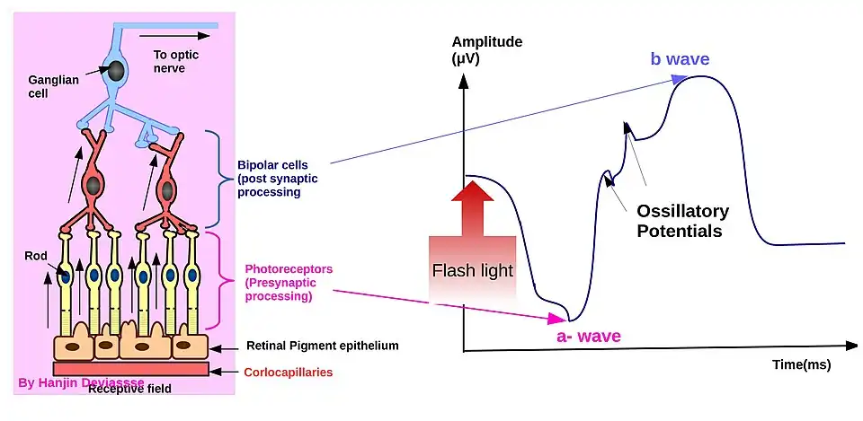 Bright flashes would bring ERGs including an a-wave (initial negative deflection) followed by a b-wave (positive deflection). The a-wave is produced by the photoreceptors, while A mixture of cells including photoreceptors, bipolar, amacrine, and Muller cells or Muller glia cause the other waves.[21]