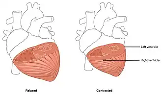 The cardiac ventricles have a complicated three-dimensional muscle fiber architecture[18]. The myofibers are composed of myofibrils. The myofibrils consist of actin and myosin filaments repeated in units called a sarcomere, the basic functional unit of the muscle fiber. The sarcomere is responsible for skeletal muscle's striated appearance and muscle contraction. In the heart of various mammals, although the myocytes are relatively short, they are connected with orientation which is commonly quantified by helix and transverse angles[19][20][21][22]. The helix angle represents the longitudinal component of the fiber orientation, whereas the transverse angle represents the transmural component of the fiber orientation. Measured transmural helix angle is typically range from +60° at the subendocardium to −60° at the subepicardium, although it is various according to measurements. And according to mathematical models of cardiac wall mechanics, it is considered that the distribution of myofiber orientation within the cardiac wall determine the distribution of stress and myofiber shortening throughout the wall during ejection[23][24][25][26].
