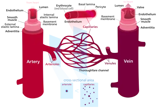 The blood vessels are the part of the circulatory system that transports blood throughout the human body[57]. There are three major types of blood vessels: the arteries, which carry the blood away from the heart; the capillaries, which exchange water and chemicals between the blood and the tissues; and the veins, which carry blood from the capillaries back toward the heart[57].