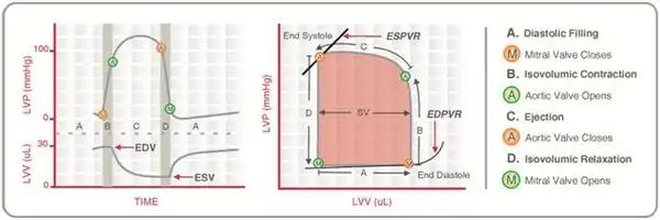 The area of the ventricular pressure–volume loop is a measure of the ventricular stroke work performed by the myocardium on the ejecting blood.It is a product of the stroke volume and the mean aortic or pulmonary artery pressure (afterload), relying on whether one is considering the left or the right ventricle.