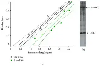 (a) Pig cardiac myocyte sarcomere length-tension relationships before and after PKA treatment.(b) An autoradiogram showing radiolabeled phosphate incorporation into pig cardiac myofibrillar proteins (MyBP-C and cTnI) upon PKA treatment.