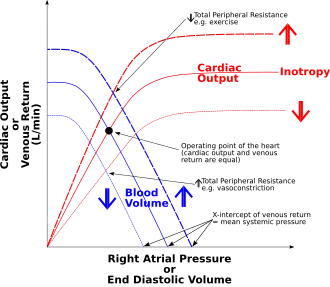 Cardiac function curve In diagrams illustrating the Frank–Starling law of the heart, the Y axis often describes the stroke volume, stroke work, or cardiac output. The X axis often describes end-diastolic volume, right atrial pressure, or pulmonary capillary wedge pressure. The three curves illustrate that shifts along the same line indicate a change in preload, while shifts from one line to another indicate a change in afterload or contractility.
