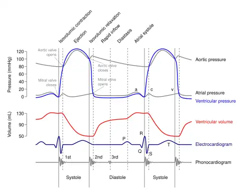 Wiggers diagram, showing various events during a cardiac cycle, with closures and openings of the aortic and mitral marked in the pressure curves.