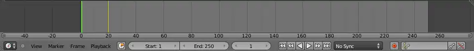 The numbers across the bottom are frame numbers, with your animation starting at frame 1. The light grey background indicates the total duration of the animation. The vertical green line is positioned at the current frame time, and the current frame number is also displayed in the box between the start/end values and the transport controls, and at the lower left of the viewport in the 3D view window. Yellow lines indicate where keyframes have been inserted.