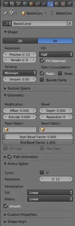 properties. Click on it, and a popup menu should appear, and you should see the name of the second curve (e.g. ”BezierCircle”). Select that name, and you should see your bevelled curve immediately take on the cross-section of the new curve.
