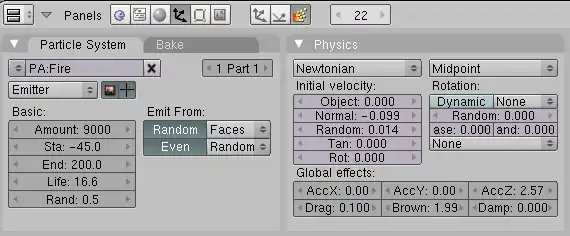 • Normal: -0.099 The particles are emitted slightly against the direction of the face normal. This leads to a bit wider fire at the base.