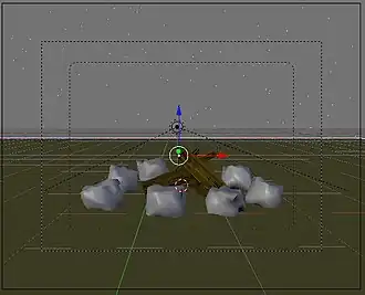 We're going to create a camp fire with a simple particle system. This tutorial is based on the method described in the Blender Manual. The result of this tutorial is shown in Fig. 1, the Blend-File is included at the bottom of this page.
