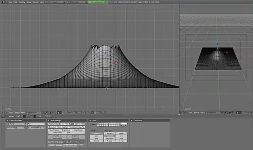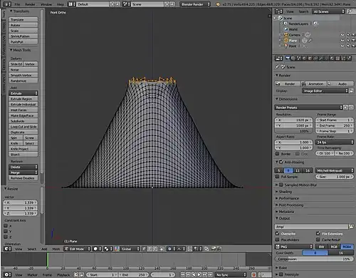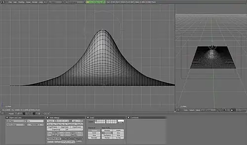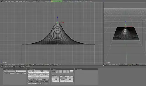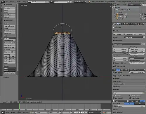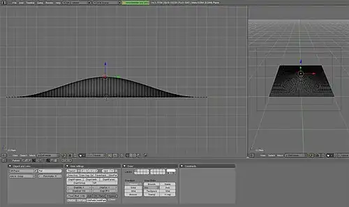 In top view, select one of the points in the middle of the plane. With this point selected change to side view. Press the O , which enables the "Proportional Edit Falloff" tool in the Menu-Panel beneath the 3-D-Window. As seen in the previous tutorial Blender 3D: Noob to Pro/Mountains Out Of Molehills when you move a vertex while edit falloff is enabled, all vertices in a defined radius of the selected vertex will align with the selected vertex when its position is altered. How they are adjusted can be chosen in the tab on the right of the yellow dot. I propose using "smooth falloff".