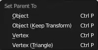 - Object: set the parent of the rest of the selection to the active (last-selected) object, clearing any existing parent relationships the new-children-to-be may have had. Any objects that were previously parented are reset to their original transformations before that previous parenting.