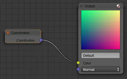 Now go to the “Add” menu (or use the usual SHIFT + A shortcut), find the “Input” submenu, and select the “Coordinates” item. This will add a new input node, which just produces the unadorned texture coordinates as its data. The newly-added node will follow the mouse around; press LMB once you have moved it to a convenient place. You will see the new node has one output terminal, titled “Coordinates”. Left-click on this, and drag to the input terminal in the Output window with the word “Color” and a small rectangular colour swatch next to it. Voilà! A line (effectively a wire) should appear connecting the two terminals, and you should see the big square colour swatch in the Output window change from black to a whole rainbow of colours. That’s your texture!