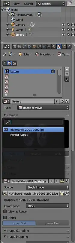To make the texture visible in renderings, you also need to add the texture to the sphere as a new material. In the Properties window, switch to the Material context by clicking the small shaded-sphere button. Create a new material by pressing the New button, leave the settings as they are for now; then switch to the Texture context. Create a new texture and select the type to be 'Image or Movie'. Select the globe texture from the dropdown menu.