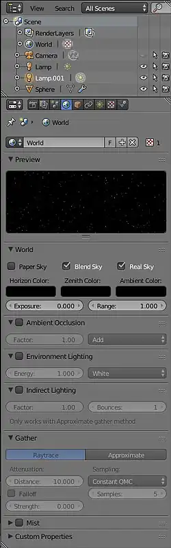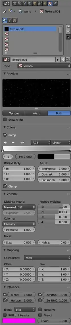 Note that in the above render I've changed the lighting and the camera position to make the image more interesting. I also added a star background, you can find the settings for this in the World context (a pretty relevant coincidence) in the Properties window and the texture settings for the World.