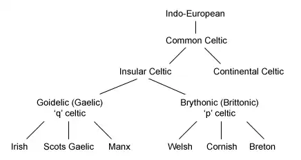 Breton is a Brythonic language most closely related to Cornish, and more distantly to Welsh. It also related to the other modern Celtic languages of Irish, Manx and Scottish Gaelic, although much more distantly as they are part of the other branch of Insular Celtic, the Goidelic branch.