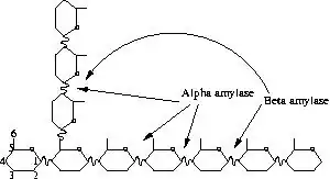 Conversion of barley starch into sugars is primarily the result of two types of enzymes - alpha amylase and beta amylase. Both enzymes break the chains of glucose which form starch at alpha 1,4 linkages. Alpha amylase breaks these bonds at random points in the starch chain. In contrast, beta amylase acts on the bond between the last 2 and 3 glucose residues in the starch chain, releasing the disaccharide sugar maltose.