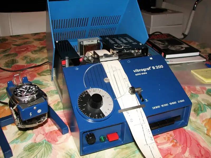 The basic components of the B200 are an inductive pick-up mounted on a multi-positional arm; an amplifier; a quartz oscillator giving an extremely stable time base; a paper tape printer; and a read-out scale. The pick-up (which is basically a microphone) conveys the sound of the watch movement to the amplifier, and it is then compared to the time base. The printer then records the difference between the two frequencies onto a moving paper tape. The resulting linear trace (called a vibrogram) can then be analysed to determine the watch’s instantaneous rate and also a variety of defects such as beat irregularity, damaged escape-wheel teeth, out of poise balance, wrong type of mainspring, damaged pallet stone, dirty escapement, etc.