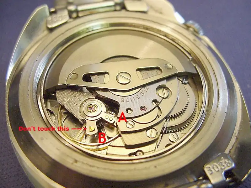 1. Regulating a mechanical watch means making it run slightly faster or slower, by making a small change in the effective length of the balance hairspring. The shorter the effective length, the quicker the balance completes its swing and so the watch runs faster. If the effective length is made greater, the opposite occurs. This change is made by moving the regulating lever, marked ‘A’ in the photo below. Note that there is also a beat adjustment lever, marked ‘B’ in the photo. This lever should NOT be touched, unless you suspect the movement is ‘out of beat’ and you have some sort of instrument such as a watch timer which will allow you to see when it is ‘in beat’ again. I will explain these terms more fully later on.