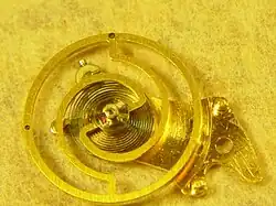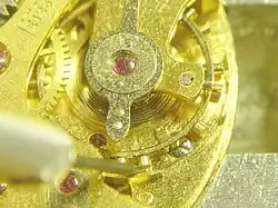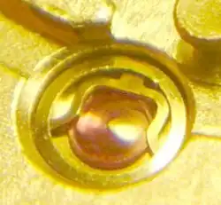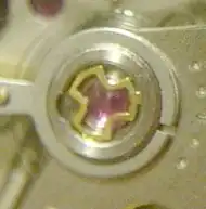 Under a shock, the heavy rim of the balance would displace and contact a rim around the circumference before enough force was applied to damage the staff or jewels. (Note the cap jewel with no shock spring)