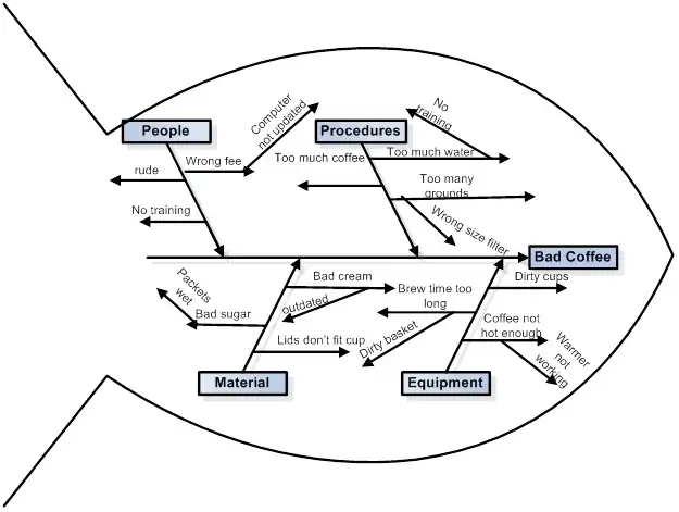 To construct a Fishbone Diagram, start with the problem you are addressing near the eye of the fish. From there, identify the primary causes of the problem. Typically, these are the 4 Ps or the 4 Ms, but can be what makes sense for the particular problem at hand. The 4 Ps are People, Procedure, Policy and Plant. The 4 Ms are Man, Machinery, Methods and Material. A sample chart showing an example of why a cup of coffee “could” be bad is as follows: