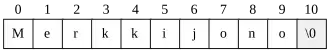 char string[11] = {'M', 'e', 'r', 'k', 'k', 'i', 'j', 'o', 'n', 'o', '\0'};