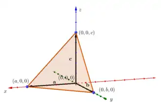 Let the plane containing and be . To find the equation of , consider its normal vector. A normal vector of is Therefore, the equation of is The desired volume is the volume under the graph of over a region , and the region is the projection of the tetrahedron on the xy-plane, which is the triangle with vertices in . Because the line passing through and has equation , the bound for is , and the bound for is given a fixed . Thus, the desired volume is On the other hand, which equals the desired volume.