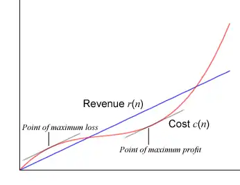 Therefore, when the profit will be maximized or minimized. Use the quadratic formula to find the roots, giving . To find which of these is the maximum and minimum the function can be tested: