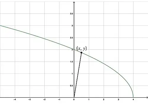 The function is graphed in the plane. At what point of the function should a particle living on it stop so that the straight line distance from that point to the origin is minimized?