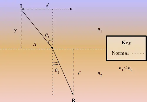 • The distance travelled by the refractive ray is .