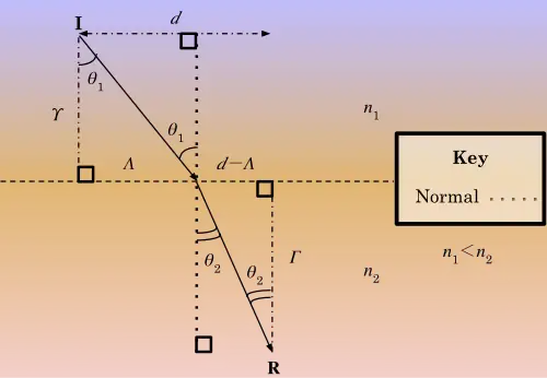 A light ray, according to Fermat's Principle of Least Time, travels in the fastest time over the least amount of distance (i.e. a light ray travels the path that results in the least amount of time wasted). The speed of a light wave is defined as the speed of light to the refractive index of the material traveled, or . Let a light wave travel through two materials, starting at and ending at where . The angle of incidence and refraction is given on the diagram to the right. What is the relationship between the light ray traveling through the two different materials?