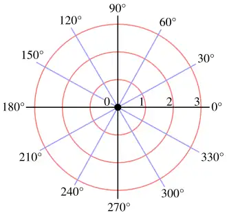 For example, the polar coordinates would be plotted as a point 3 units from the pole on the ray. The coordinates would also be plotted at this point because a negative radial distance is measured as a positive distance on the opposite ray (the ray reflected about the origin, which differs from the original ray by ).