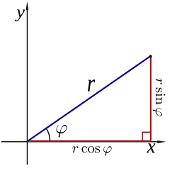 The two polar coordinates can be converted to the Cartesian coordinates by using the trigonometric functions sine and cosine: