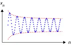 An infinite sequence of real numbers (in blue). This sequence is neither increasing, nor decreasing, nor convergent. It is however bounded.