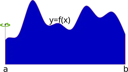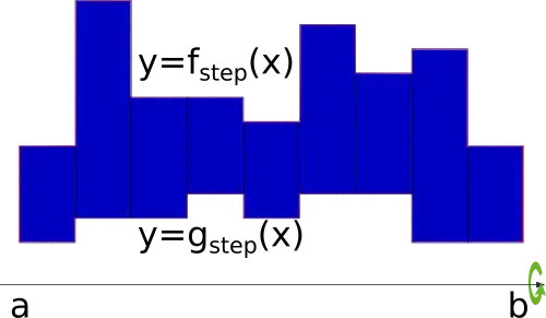 Consider the solid formed by revolving the region bounded by the curve , which is continuous on , and the lines , and around the -axis. We could imagine approximating the volume by approximating with the stepwise function shown in figure 2, which uses a right-handed approximation to the function. Now when the region is revolved, the region under each step sweeps out a cylinder, whose volume we know how to calculate, i.e.