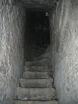 Finally, staircases may be placed on alternate sides of the structure (for example, from ground to first floor the staircase is on the north side, from first to second floor, it is on the south side). This arrangement means the attackers have to fight their way across the floor to reach the next staircase. In some designs, the rooms would be split in half with a wall and doorway creating an extra defensive point.