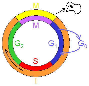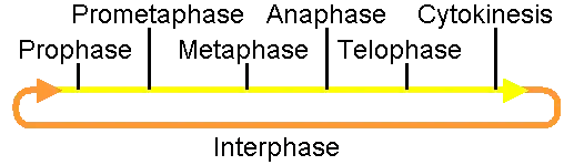 The cell cycle is the cycle of a biological cell, starting from the time it is first formed from a dividing parent cell until its own division into two cells, consisting of repeated mitotic cell division and interphase (the growth phase). A cell spends the overwhelming majority of its time in the interphase(about 90% of time).
