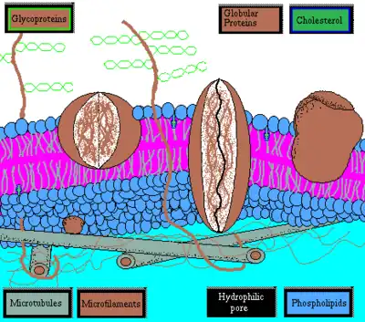 The smaller molecules shown between the phospholipids are Cholesterol molecules. They help to provide rigidity or stability to the membrane. The two main components of phospholipids are shown in these figures by blue circles representing the hydrophilic head groups and by long thin lines representing the hydrophobic fatty acid tails.
