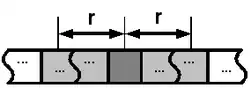 Usually the neighborhood in 1D is described by its radius , meaning the number of cell left and right from the central cell that are used for the neighborhood. The output cell is positioned at the center.