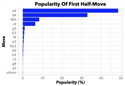 e4 49%, d4 33%, Nf3 8%, c4 6%, g3 1%, b3 1%, f4 1%, all other moves less than 0.5%.