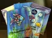 Rainbow Fish to the Rescue is the sequel to the national bestseller, The Rainbow Fish. In this book, Marcus Pfister continues his excellence in illustrations with the same water color and foil stamping techniques. Again, his illustrations speak as loud as the words and offer more insight to the stories. The pictures could stand alone and the reader would still know the plot of the story. The words however do offer a multimodal aspect of literature. Marcus Pfister uses typesetting to have some words in the story express more meaning. By doing this, it excites the reader and keeps them entertained and engaged as they finish reading the story.
