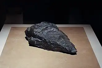 This triangle pointed tool, excavated at Shanxi Province, China, was made from a large flake of a type of metamorphic rock with the back shaped into a sharp ridge and was used to dig up plant and tree roots.