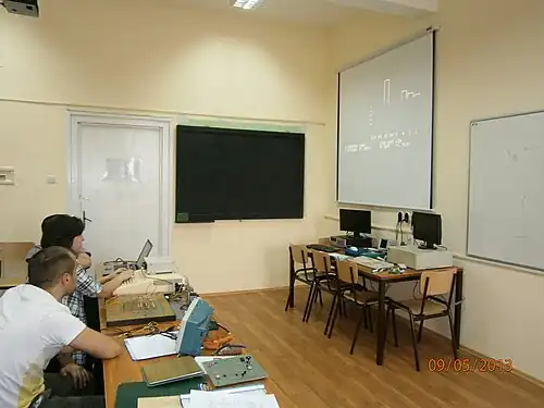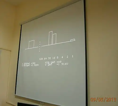 Similarly, we can illustrate the operation of an analog-to-digital converter with a discrete weight, where the output value – a digital code – is presented as a sum of reference weights. The picture below shows such a demonstration in the laboratory performed using a MICROLAB system connected to an 8-bit DAC. The PC video output is connected to a multimedia projector.