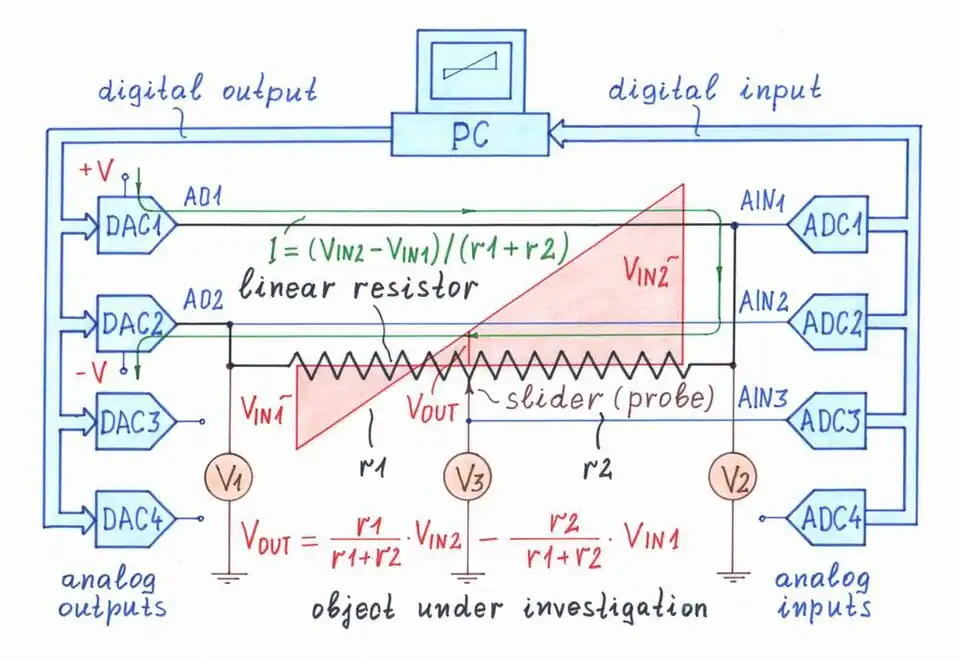 For example, in this way we can represent the operation of an op-amp circuit with negative feedback by displaying a "live" analog scale on the screen. Input and output voltages are represented by weights of proportional size on both sides of the scale.