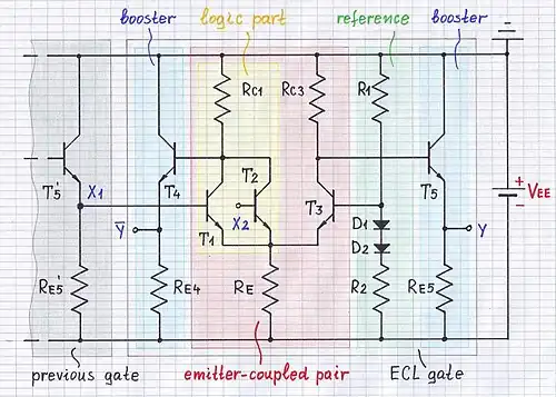 A problem appears when the input voltage approaches the high threshold (logical "1") and the transistors of the ordinary logic circuits (RTL, DCTL, DTL and TTL) saturate; as a result, they work slowly. But, as curious readers would think, the differential (emitter-coupled) amplifier couldn't solve this problem as, in this area, the reference transistor T3 is cut-off and the differential amplifier is not an amplifier. In actul fact, the long-tailed pair is cut in two and this structure is no more a differential amplifier; its two new parts are something else. So, the paradox of this classic viewpoint is that we use a differential amplifier where actually it is not a differential amplifier!
