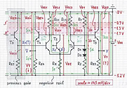 Left part. The preceding output stage (the emitter follower T5') has already set high input voltage VH = -0.9 V at T1 base. As above, you may think of the emitter follower T1 and the emitter resistor RE as a voltage-controlled current source (voltage-to-current converter or a transconductance amplifier) passing a current IC1 = (VRE5' - VBE1)/RE through the collector resistor RC1. Or you may think again of the combination RE, T1 and RC1 as of a common-emitter amplifier (as above, it is sooner an attenuator with K = Rc1/Re < 1) with emitter degeneration driven by the constant voltage VRE5'. The resistance RC1 (220 Ω) is chosen so that, at high input voltage VIN = VH = -0.9 V, the T1 collector current to create voltage drop VRc1 = 1 V across it. So, the output voltage VY = 0 - VRc1 - VBE4 = 0 - 1 - 0.7 = -1.7 V (logical "0"). The voltage drop across T1 is VCE1 = VC1 - VE = - 1 + 1.6 = 0.6 V and the transistor is still not saturated. The output voltage depends on the resistances RE, RC1 and the input voltage VIN; so, it will vary if they vary. As Rc1/Re = 0.22 the output voltage depends slightly on the input voltage (it won't depend at all if we replace RE by a constant current source). But again, as above, these variations will not accumulate after next several stages since the input transistor T1 (T2) of the next ECL gate will be cut off and its collector voltage (accordingly, the output voltage VY) will not depend on the gate input voltage. T3 collector voltage (accordingly, the output voltage VY) of the next gate will not depend on the gate input voltage as well; it will depend on its reference voltage.