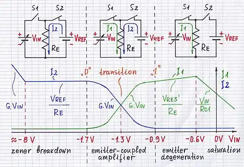 ECL is based on a transistor stage with switchable voltage and current emitter sources: at low input voltage, the sources are disconnected from the emitter; during the transition, both the voltage and current source are connected; at high input voltage, only the current source is connected to the emitter.
