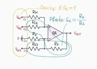 Daisy’s Theorem tells: the sum of the gains in a single op-amp amplifying circuit is equal to 1.[4] Only, don't you think that it seems quite strange to sum gains? It is far natural to think that voltage summers sum voltages! Then, let's examine this author's assertion.
