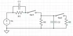 RC circuit, goal is to find equation for current through capacitor 2 as a function of time ... initially sw1 is short and sw2 is open, then sw1 opens simultaneously with sw2 closing.